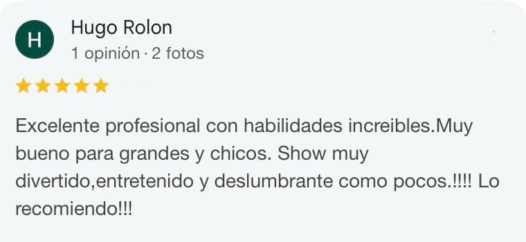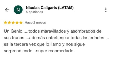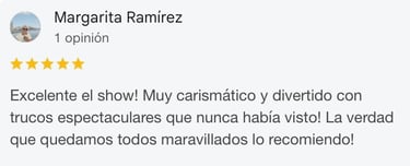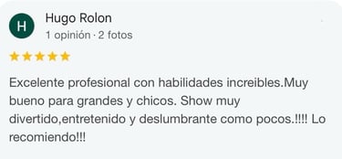 Incluye trucos impactantes donde el público es parte del espectáculo. Es una experiencia ideal si querés contratar un show de magia diferente, divertido y original.